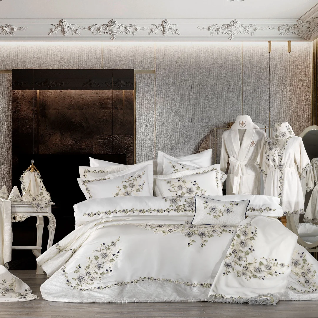 Zebra Casa Azur Premium Çeyiz Seti Toplamda 23 Parçadan oluşmaktadır. Zebra Casa diğer ürünlerinde olduğu gibi Azur Çeyiz Setinde de Kalitesinden Ödün Vermeden, Üst Düzey Ürününü Sizlere Sunmuştur. Azur Çeyiz Paketi İçerisinde Çeyizinize Dair Birçok Detay Eksiksiz Olarak Düşünülmüştür. Azur Çeyiz Paketi , Tarz Olarak Modern, Avangart Olarak Tasarlanmıştır , Yeni Tarz Mobilyalar İle Uyum Sağlamaktadır. Setin Tüm Parçalarında Zebra Casa' nın Kendi Üretimi Olan Özel Olarak Tasarlanmış Üç Boyutlu Danteller Kullanılmıştır.