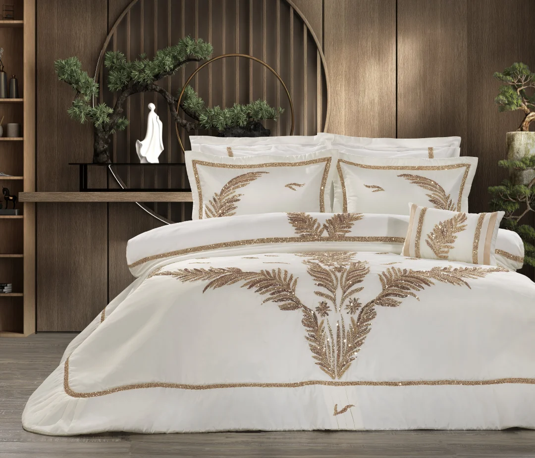 Yeni evlenen çiftlere ve çeyiz alışverişi yapanlara özel olarak tasarlanan Caroline Yatak Seti, zarif detayları ve lüks tasarımıyla yatak odalarına şıklık katıyor. Çeyiz kültürünü modern anlayışla buluşturan bu set, dekoratif ve işlevsel parçalarıyla dikkat çekiyor.