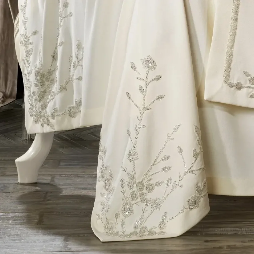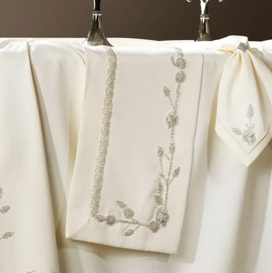 Zebra Casa Elenor Masa Örtüsü Seti Toplamda 26 Parçadan Oluşmaktadır. Zebra Casa'nın Özel Üretimi Boncuk İşlemeli Yaprak Motifini Anımsatan Deseniyle Misafirlerinize İhtişamlı Bir Masa Hazırlayın. Gözleri Kamaştıran Parlaklığıyla Sizi Kıskananlar Yemekleri Bilerek Örtünüze Dökebilirler. Masa Örtüsü Kumaşı Yüksek Sıklıkta Dokunmuş, Teflonlanma Özelliğine Sahip Leke Tutmaz Kumaş Tercih Edilmiştir. Ortasında İse 40x140cm Ebatında Taş Efektli Runner Kullanılmıştır. Peteçe Detaylarında Yine Aynı Şekilde Taş Detaylar İşlenmiş Olup, Gümüş ve Taşlı Yüzükleriyle Tüm Dİkkatleri Üzerine Çekmektedir. Yemek Lezzetinin Önüne Geçecek Elenor Setimiz, Sizleri Beklemektedir.