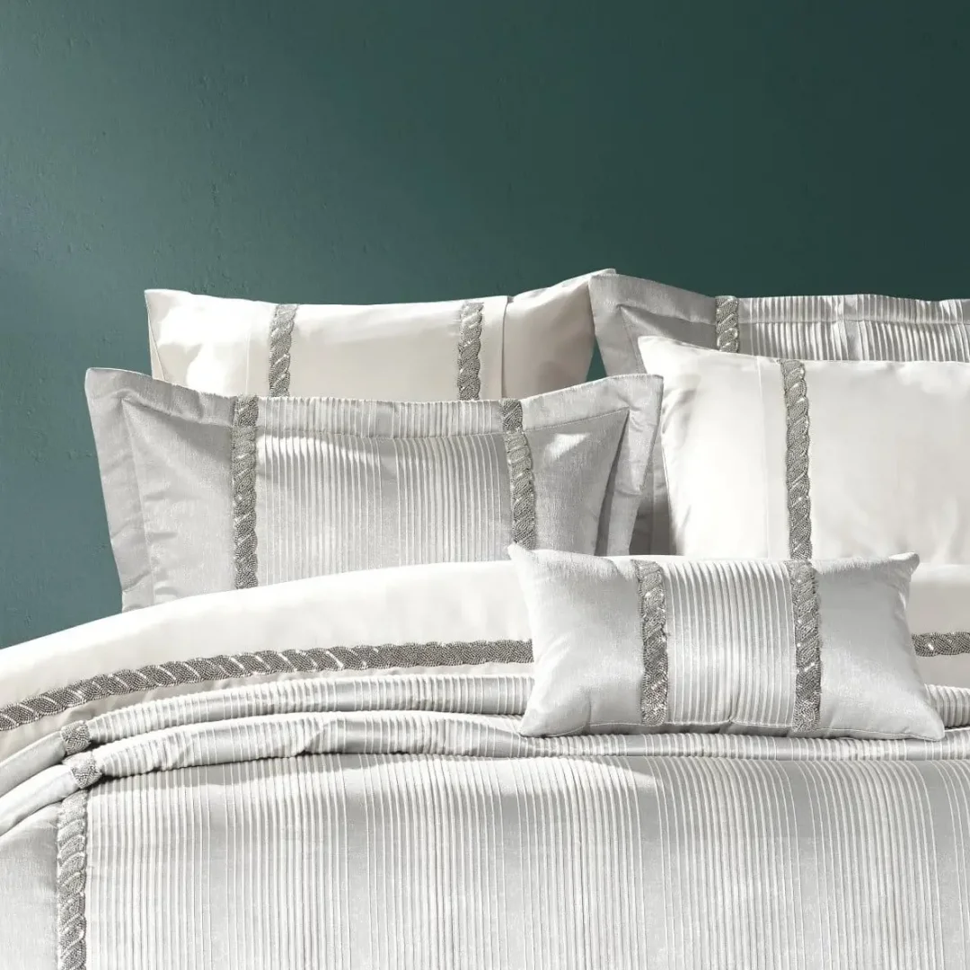 ZebraCasa Grace çeyiz seti toplamda 10 parçadan oluşmaktadır. Nevresim,çarşaf ve yastık kılıfı kumaşı %100 pamuk saten kumaştan üretilmiştir. Nevresim kapağında ve dekoratif yastık kılıflarında örtü ile aynı modele sahip taş işlemesi detayı bulunmaktadır. Yatak örtüsü ince elyaf dolguludur, kumaş kalitesi ise yüksek gramajlı jakarlı kumaştan üretilmiştir ve örtünün sağ ve sol kısımında ise şerit halinde taş işlemesi mevcuttur.